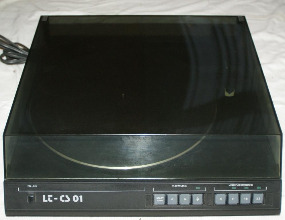 LT-CS 01 Der LT-CS 01 erschien 1986 im VEB Elektronische Bauelemente Teltow. Der automatische Plattenspieler verfügt über einen Lineartonarm und die Tonarmsteuerung erfolgt über Folientasten an der Front. Neben Geräten in anthrazit (Bild) gab es noch grau, silber und braun und mit unterschiedlichen Siebdrucken auf der Front. Der LT-CS 01 kostete 595,- M.
