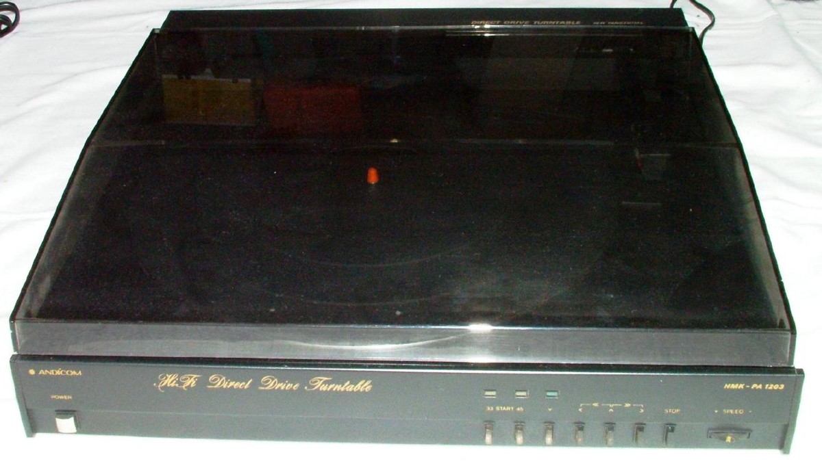 HK-PA 1203 Der HK-PA 1203 erschien 1986 und ist ein vollautomatischer Plattenspieler mit Direktantrieb und Tangentialtonarm. Optisch wurde er an die HMK 100 angepasst und war in schwarz und silber erhältlich. Die Bedienung erfolgt über Tipptasten. Dabei sind folgende Funktionen möglich: Wahl der Drehzahl 33 oder 45, Stop, Tonarm heben, senken, nach links bewegen und nach rechts bewegen. Weiterhin verfügt das Gerät noch über eine Drehzahlfeinjustierung. Als Abtastsystem wurde das VM 2103 von Tesla verwendet. Ein häufiges Ärgernis sind die ausgebrochenen Deckelhalterungen an den Scharnieren. So sind kaum Geräte mit intakten Halterungen zu finden. Oftmals wurden die Winkel eingeklebt oder mit abenteuerlichen Schraubverbindungen am Deckel befestigt.